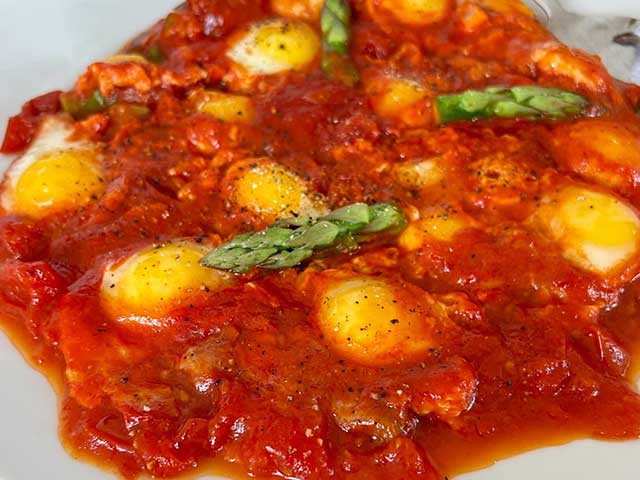 トマトソースに卵を割り入れて半熟で食べるというお料理です。