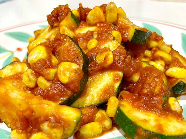 コチラはガーリックのトマトソースを使ってズッキーニ、とうもろこしを炒めたメニューです。