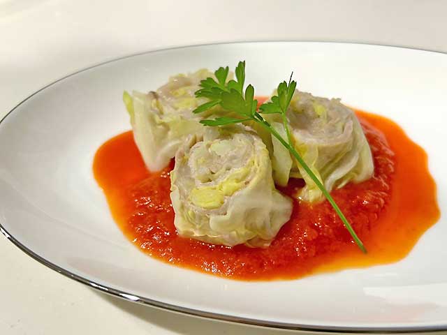 キャベツと薄切り肉をくるくるっと巻いて、ソースをかけるだけで見た目も味も本格イタリアン。