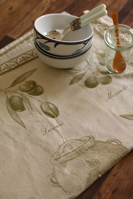 ナチュラルで落ち着いたオリーブ色のジャカード織のクロスは、程よい厚みがあります。クロスはコットン100パーセント。テーブルの上ではランチョンマット代わりに、壁に掛ければタペストリーとしてもお楽しみいただけます。